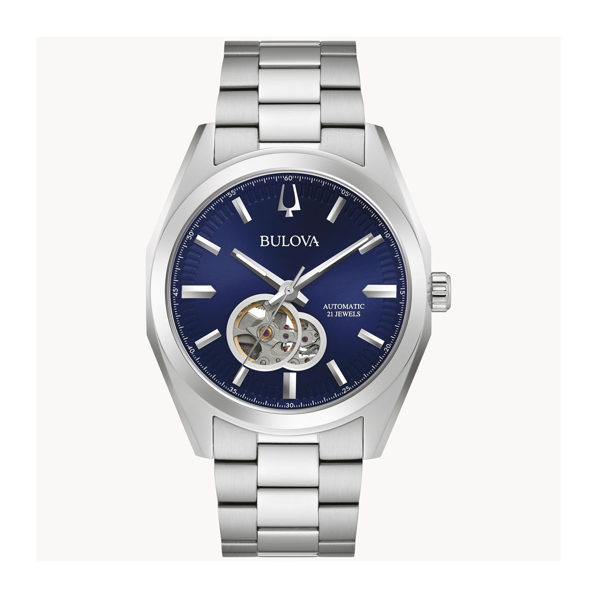 Part of the Surveyor line of Bulova watches, this updated classic automatic watch offers all of the detail and quality you would expect in a luxury watch, while staying at an affordable price point. The stainless steel case and bracelet are paired with a blue three-hand dial with silver-tone accents and an open aperture to view the movements balance wheel and escapement. The screw-back case is topped with a mineral crystal exhibition window to showcase the automatic movement powering the timepiece. This beautifully detailed, quality timepiece is destined to become a new favorite in any collection.