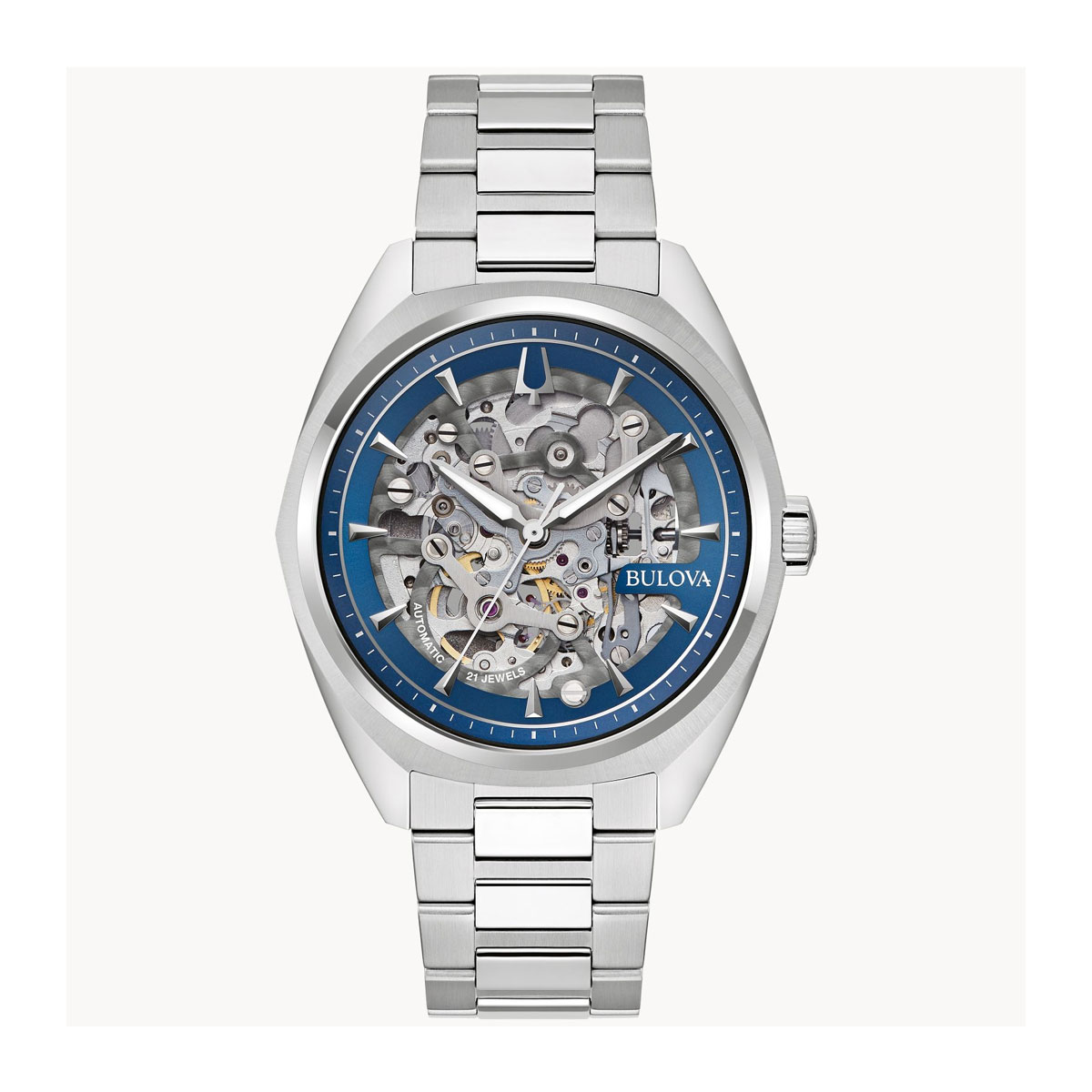 This new mens automatic timepiece from the Bulova Surveyor collection offers modern design and luxurious craftmanship at an exceptional price. The contemporary stainless-steel case delivers an eye-catching brushed and polished surfaces with a subtle angularity and a domed mineral crystal. The remarkable dial is dominated by the display of the skeletonized automatic 21-jewel movement, which features a 42-hour power reserve. Surrounding the dial is a blue chapter ring with applied hour indices, which is complemented by angular hands with luminescent fill. The watch is paired with a matching stainless-steel bracelet for a seamless look on the wrist. With a captivating dial and appealing design, this watch is the perfect timepiece for everyday style.