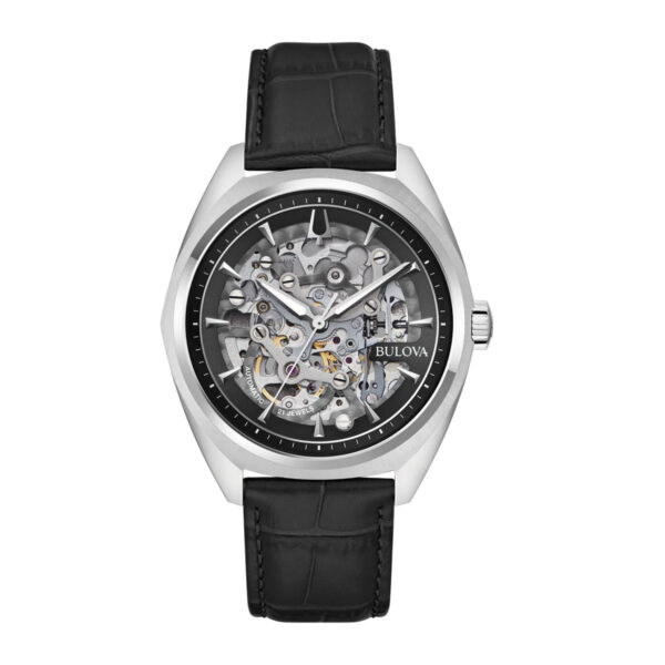 This new mens automatic timepiece from the Bulova Surveyor collection offers modern style and luxurious craftmanship at an exceptional price. The contemporary silver-tone stainless steel case conveys an eye-catching blend of brushed and polished surfaces with a subtle angularity and a domed mineral crystal. The remarkable dial is highlighted by the display of the skeletonized automatic 21-jewel movement, which features a 42-hour power reserve. Surrounding the dial is a black chapter ring with applied hour indices, which is complemented by angular hands with luminescent fill. The watch is paired with a refined black leather strap with a 3-piece closure for an ideal fit. With a striking dial and captivating design, this watch is the perfect timepiece for everyday style.