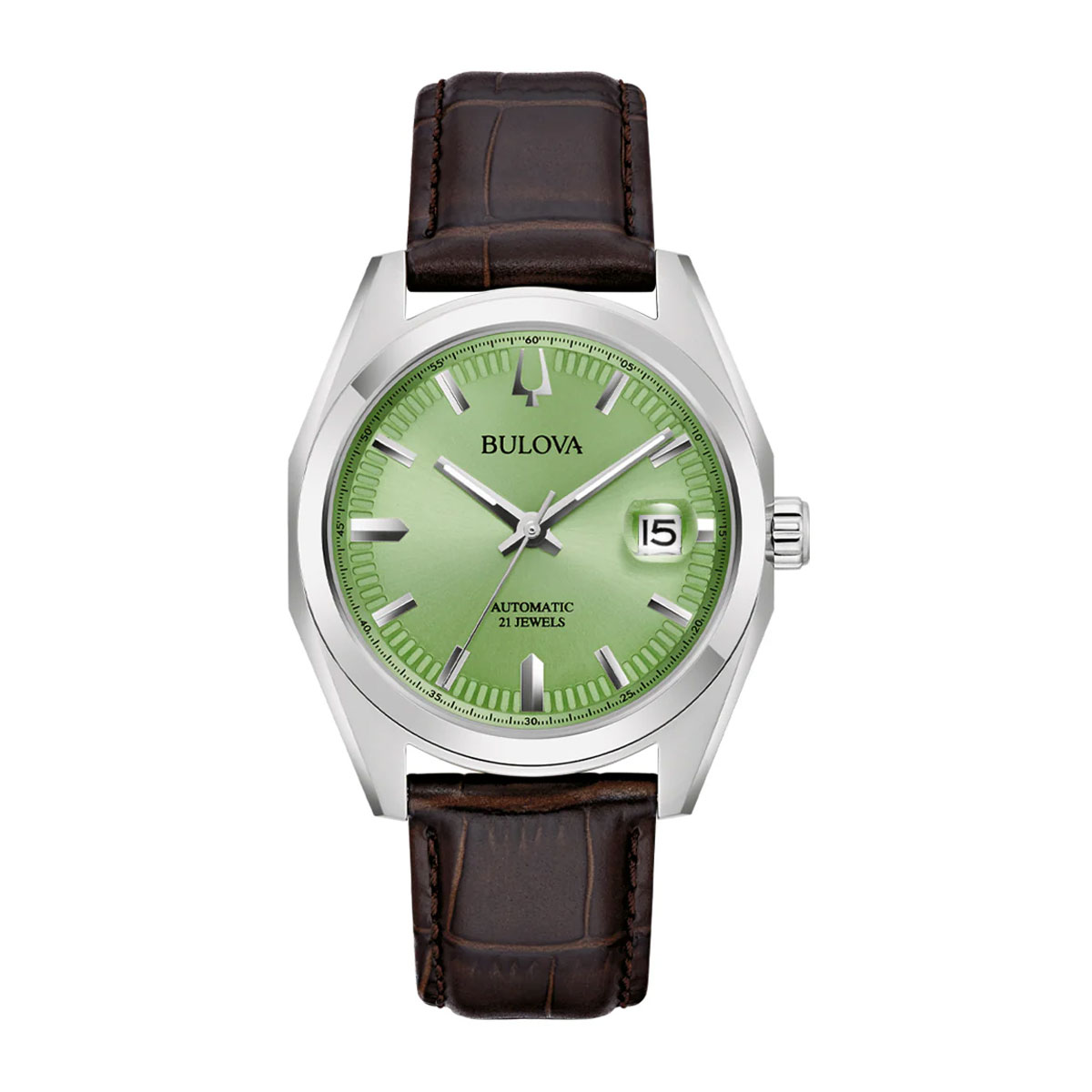 The Bulova mens Surveyor is defined by exceptional quality and sophisticated aesthetics. The silver-tone stainless steel case features sculpted edges and faceting which provide an effortless wear on the wrist, with polished and brushed finishing, a flat sapphire crystal, and a quick-release brown leather strap. The striking pistachio radiant sunburst finish and features silver-tone accents, hands with luminescent fill, debossed minute markers, and a magnified date display. The watch is powered by an 21-jewels and a 42-hour power reserve, which can be seen in full through a mineral crystal exhibition window in the caseback. For those with a discerning eye for refined luxury, this Bulova mens timepiece is the obvious choice.