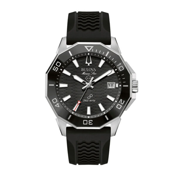 An incredibly bold design, this mens Bulova Marine Star Precisionist sport watch pushes the limits with Bulovas cutting edge technology and a strikingly modern case. Defined by a rugged, angular profile, the 43mm stainless steel case features brushed facets and polished accents, with a unidirectional timing bezel with a ceramic insert, a sapphire crystal, and a screw-down crown ensuring 200m water resistance. The vibrant black dial takes its inspiration from the undulating crests of the ocean, with a wave pattern accented by applied hour markers and a bold handset, all featuring luminescent material for unrivaled legibility in all conditions. A date window is positioned at 3 oclock, while the red-tipped seconds hand sweeps smoothly around the dial thanks to Bulovas proprietary Precisionist movement, a revolutionary 8-jewel quartz mechanism vibrating at a remarkable 262kHz and accurate to 10 seconds per year with increased resistance to temperature changes. Paired with a durable silicone strap with a pin buckle closure, this mens Bulova timepiece is equipped to handle everything from the office to the ocean.