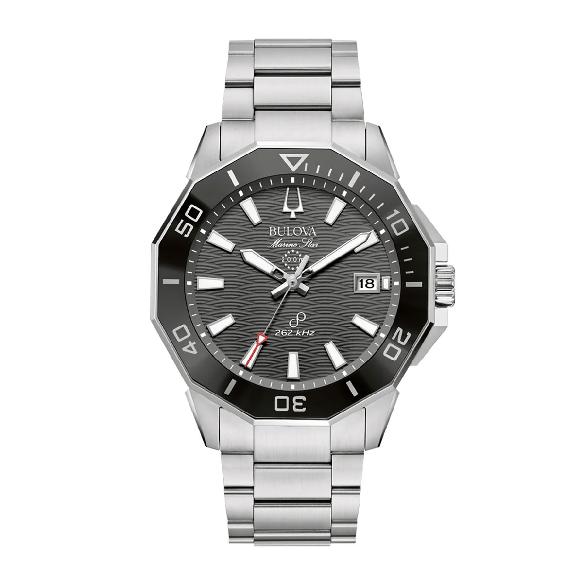 An incredibly bold design, this mens Bulova Marine Star Precisionist sport watch pushes the limits with Bulovas cutting edge technology and a strikingly modern case. Defined by a rugged, angular profile, the 43mm stainless steel case features brushed facets and polished accents, with a unidirectional timing bezel with a ceramic insert, a sapphire crystal, and a screw-down crown ensuring 200m water resistance. The vibrant black dial takes its inspiration from the undulating crests of the ocean, with a wave pattern accented by applied hour markers and a bold handset, all featuring luminescent material for unrivaled legibility in all conditions. A date window is positioned at 3 oclock, while the red-tipped seconds hand sweeps smoothly around the dial thanks to Bulovas proprietary Precisionist movement, a revolutionary 8-jewel quartz mechanism vibrating at a remarkable 262kHz and accurate to 10 seconds per year with increased resistance to temperature changes. Paired with a durable stainless steel bracelet with a pin buckle closure, this mens Bulova timepiece is equipped to handle everything from the office to the ocean.