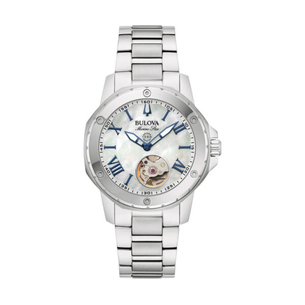 Embrace a bold new you with the sporty Bulova ladies automatic Marine Star. The silver-tone stainless steel case features an engaging blend of finishes for a dynamic presence on the wrist, while the sapphire crystal and protected crown provide modern reliability which is furthered by 100m of water resistance. The lustrous mother-of-pearl dial features silver-tone accents, with roman numeral hour markers and dramatic hands with luminescent fill to ensure legibility in every situation. On the lower half of the dial, a silver-tone ring frames an aperture offering a glimpse at the beating heart of the slim premium automatic movement, which features 24 jewels and a 42-hour power reserve. Completing the timepiece is a stainless steel bracelet with a push-button deployant closure which provides exceptional comfort and security. With its elegant luxury and mechanical soul, this Bulova ladies timepiece is sure to carry you through the day in timeless style.