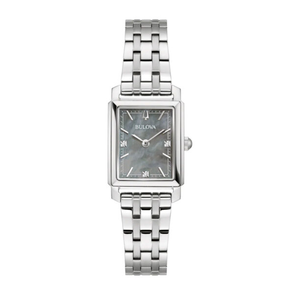 This petite Bulova womens timepiece adds new style to the already impressive Sutton Collection. The refined silver-tone stainless steel rectangular case features a mineral crystal and finishing that shines brilliantly in the light. The lustrous gray mother-of-pearl dial features diamond accents and silver-tone hands and markers for a look of true elegance. A matching five-link silver-tone stainless steel bracelet features a deployant closure with pushers for a perfect fit and latched spring bars for easy release. A versatile Bulova ladies timepiece perfectly styled for a woman who is looking to add an elegant finishing touch to her ensemble.
