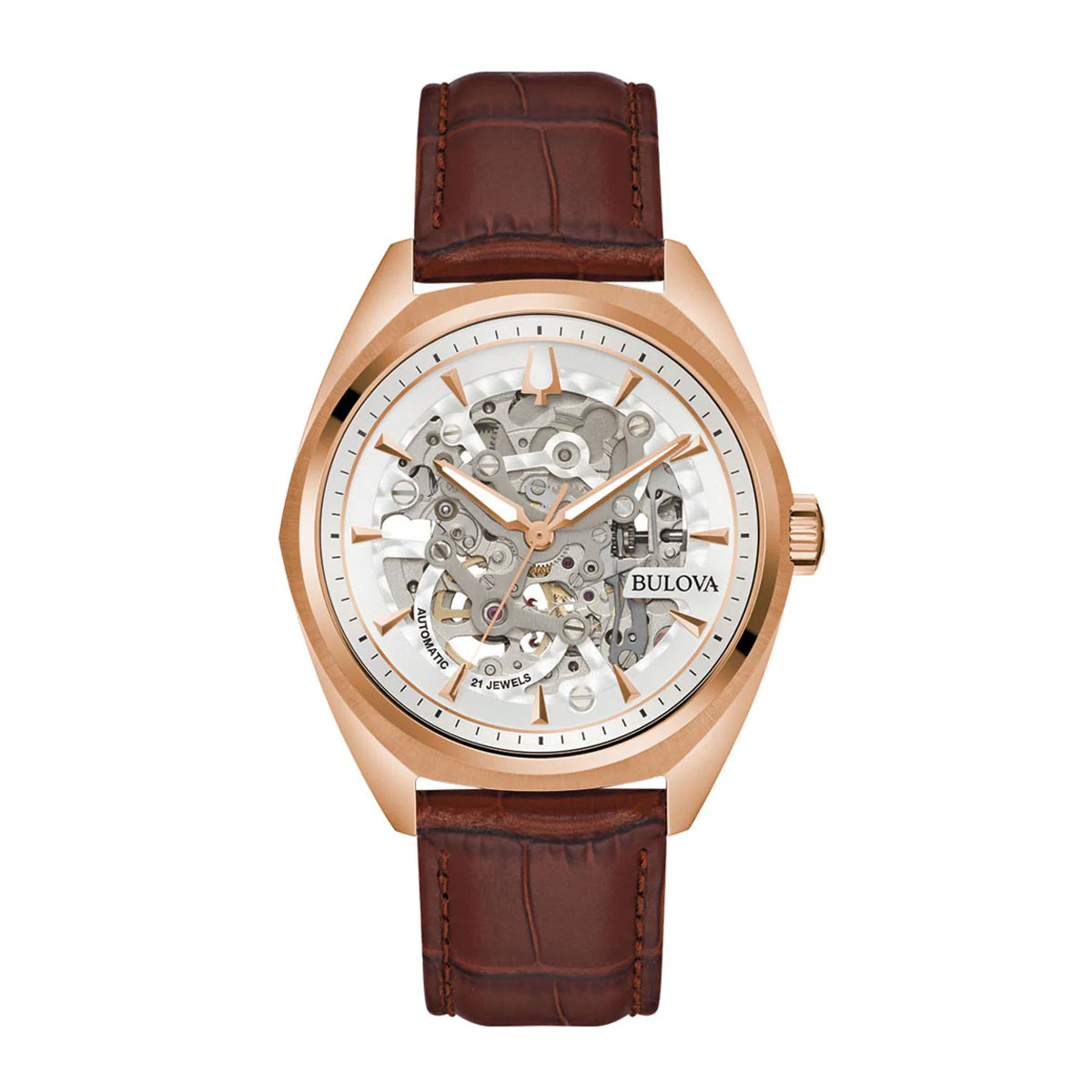 This new mens automatic timepiece from the Bulova Surveyor collection offers modern elegance and luxurious craftmanship at an exceptional price. The contemporary rose gold-tone stainless steel case delivers an eye-catching blend of brushed and polished surfaces with a subtle angularity and a domed mineral crystal. The remarkable dial is highlighted by the stunning display of the skeletonized automatic 21-jewel movement, which features a 42-hour power reserve. Surrounding the dial is a silver white chapter ring with rose gold-tone applied hour indices, which is complemented by matching angular hands with luminescent fill. The watch is paired with a refined brown leather strap with a 3-piece closure for an ideal fit. Step out in stylish sophistication with this new Bulova mens timepiece.