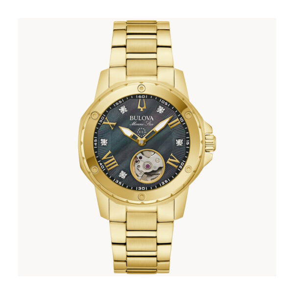 Embrace a bold new you with the chic Bulova ladies automatic Marine Star. The striking gold-tone stainless steel case features an engaging blend of finishes for a dynamic presence on the wrist, while the sapphire crystal and protected crown provide modern reliability which is furthered by 100m of water resistance. The lustrous black mother-of-pearl dial features gold-tone accents, with a combination of diamond and roman numeral hour markers, with dramatic hands with luminescent fill to ensure legibility in every situation. On the lower half of the dial, a gold-tone ring frames an aperture offering a glimpse at the beating heart of the slim premium automatic movement, which features 24 jewels and a 42-hour power reserve. Completing the timepiece is a matching quick-release gold-tone stainless steel bracelet with a push-button deployant closure for exceptional comfort and security. With its elegant luxury and mechanical soul, this Bulova ladies timepiece is sure to carry you through the day in timeless style.