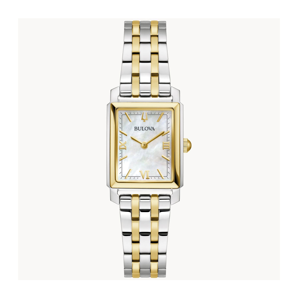 This all-new Bulova ladies timepiece adds new style to the already impressive Sutton Collection. The elegant two-tone stainless rectangular steel case with a silver-tone body and a gold-tone frame around the mineral crystal. The opalescent mother-of-pearl dial is accented with gold-tone hour markers and matching hands for a look of true sophistication. A matching five-link bracelet features a deployant closure with pushers for a perfect fit. This Bulova ladies timepiece is perfectly styled for the woman who is ready to make a statement.