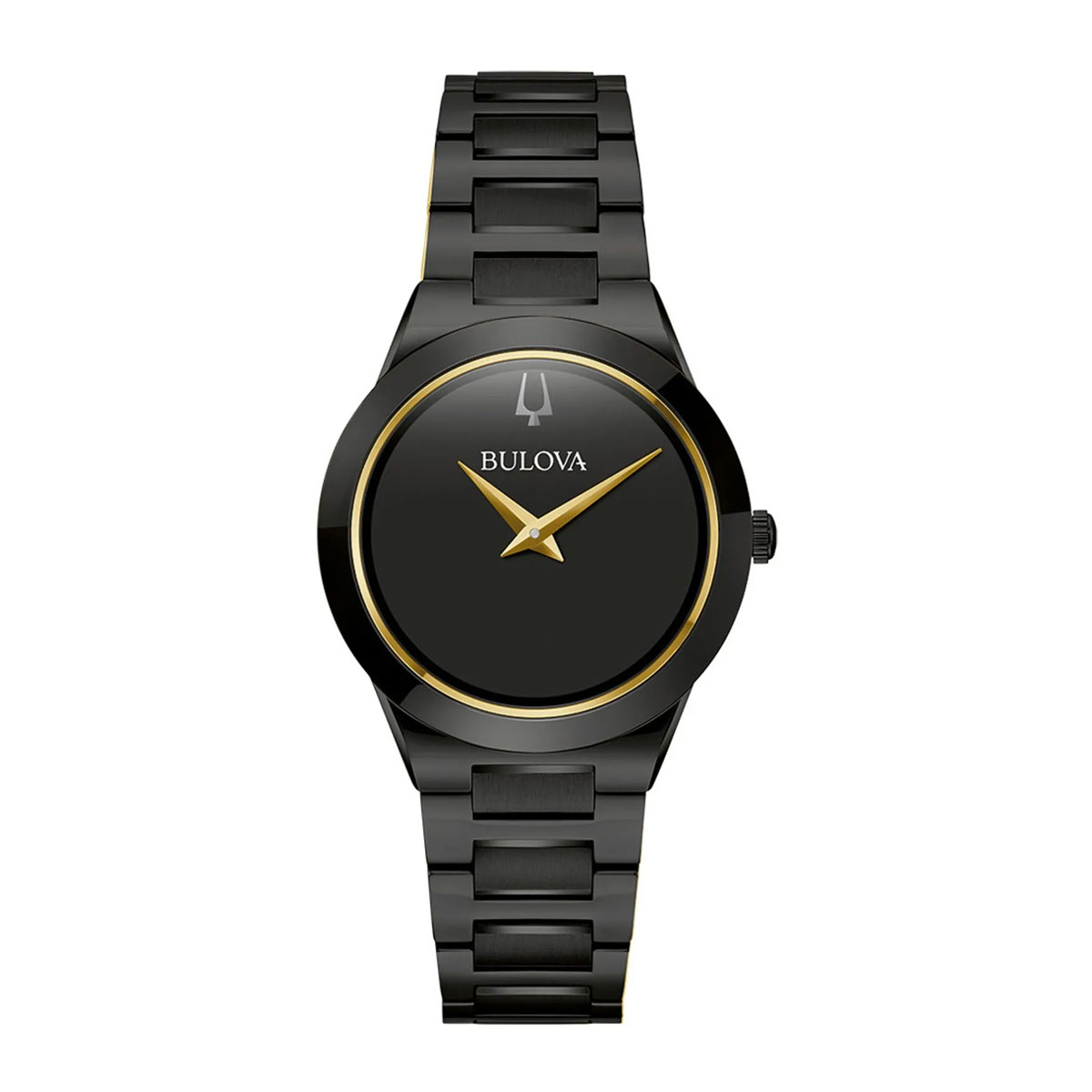 A masterclass in modern design, this sophisticated timepiece from the Bulova ladies Modern collection will add a contemporary edge to your style playbook. The black IP stainless steel case design features a metalized domed edge-to-edge sapphire crystal that extends to form the black bezel of the timepiece, while a sleek silhouette flows seamlessly into a matching black IP stainless steel bracelet with brushed center links and a push-button deployant closure for a sleek profile. A gold-tone case ring encircles the dramatic black dial, which pushes the limits of minimalism with no markers and angular gold-tone hands. An uncompromising commitment to modern design, this Bulova ladies timepiece will push any wardrobe beyond convention.