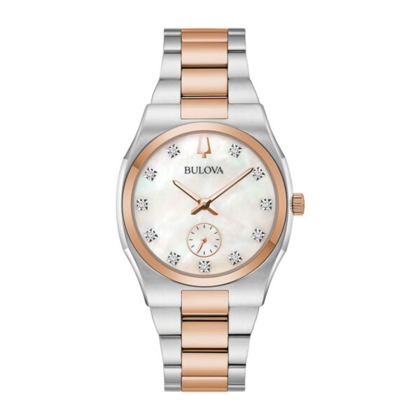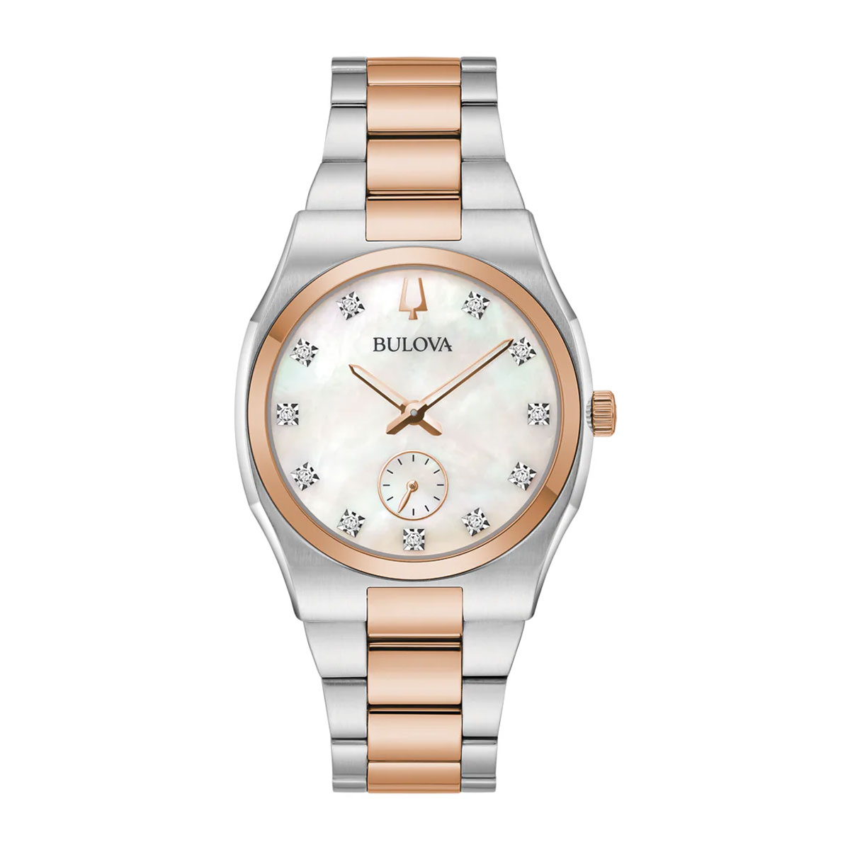 New to our classic Surveyor line, this new model offers a timeless design with an elegant flair. Featuring a two-tone rose gold and stainless-steel case and matching bracelet, white mother-of-pearl dial with 11 hand-set diamonds and rose gold hands that boast the look and feel of a luxury watch. This quality timepiece is well-made and beautifully detailed, making it an elegant addition to any collection.