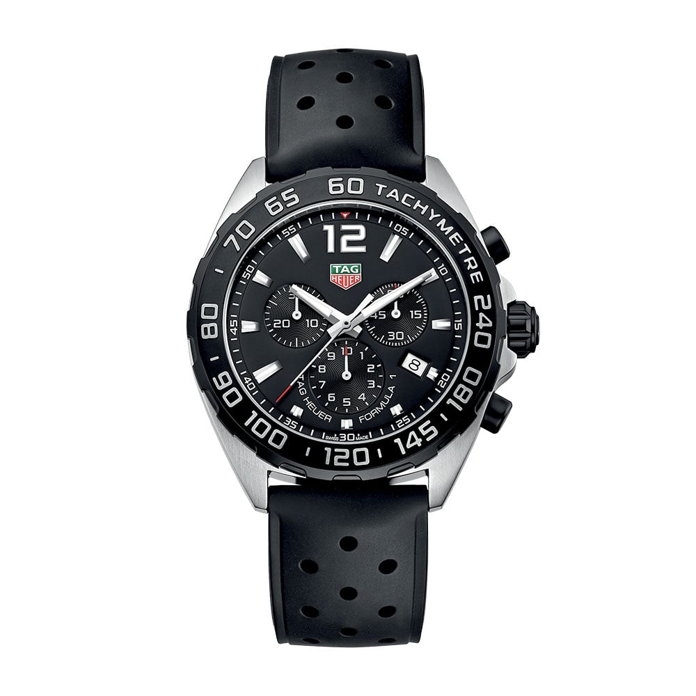 A high-precision quartz racing chronograph with an all-black dial and 200-meter water resistance. Inspired by motor-racing, this robust model is built for speed, endurance and audacity.