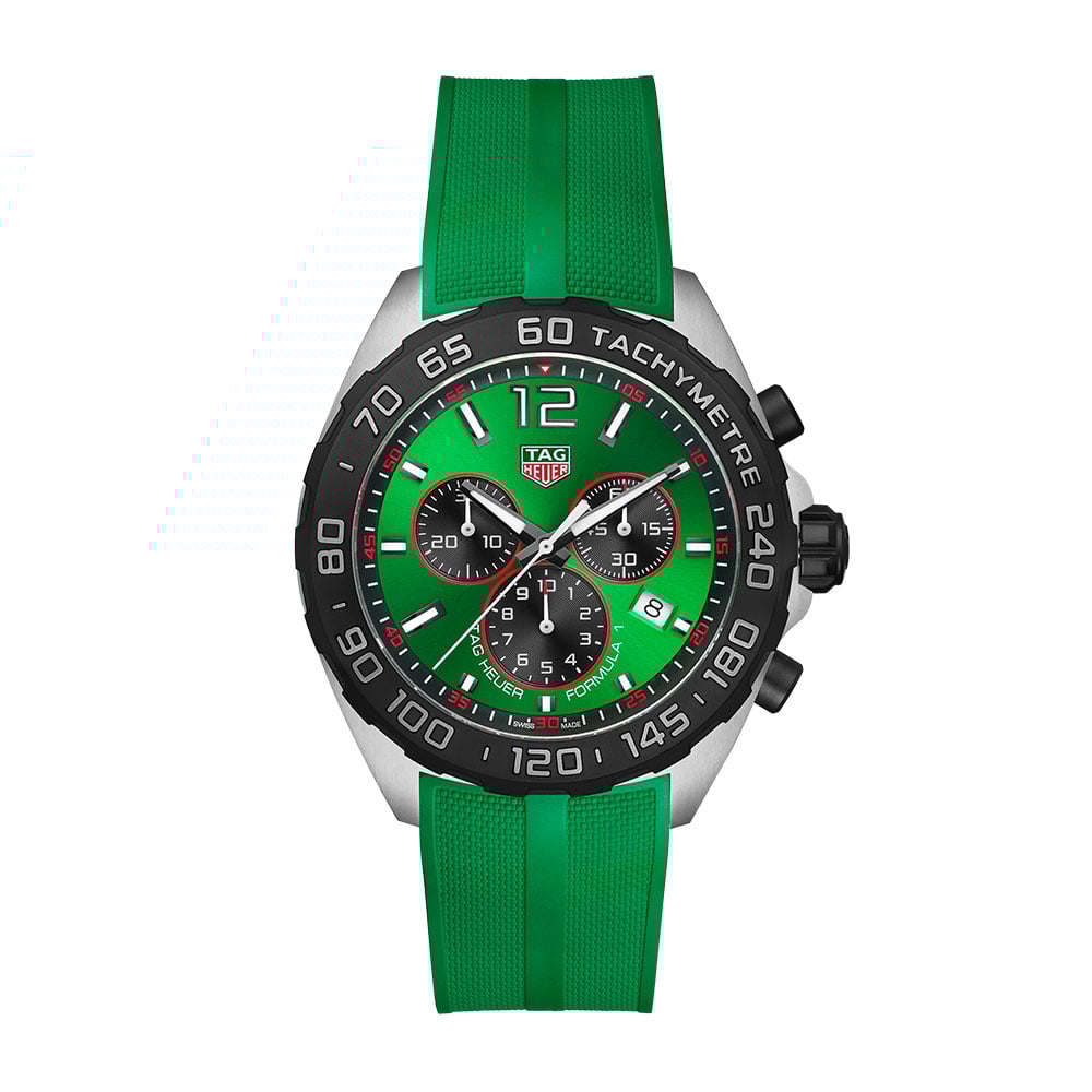 Setting the pace with colour and cool is the TAG Heuer Formula 1. A versatile 43mm chronograph with vivid green dial and matching rubber strap, full of sportive design codes, the motor racing collection is roaring ahead to victory.