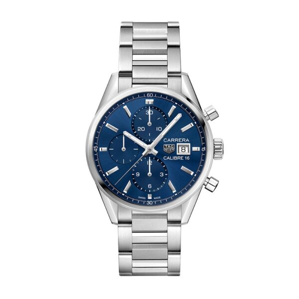 A contemporary classic. One of the bestselling chronographs in the Carrera collection, with blue sunray brushed dial, striking blue sub-dials and 3-row bracelet in rhodium-plated steel.