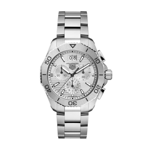 Ready for your next feat? There is no question that this all-silver 40mm TAG Heuer Aquaracer will go with you anywhere. Made of steel and designed to offer maximum ergonomy, this elegant watch is crafted for performance