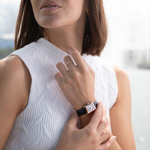 Boasting clean lines an an elegant polished case, this watch sports a classic white dial with a decorative Clous de Paris motif and traditional Roman-numeral hour markers. The square shape makes it the perfect fit for any woman’s wrist.