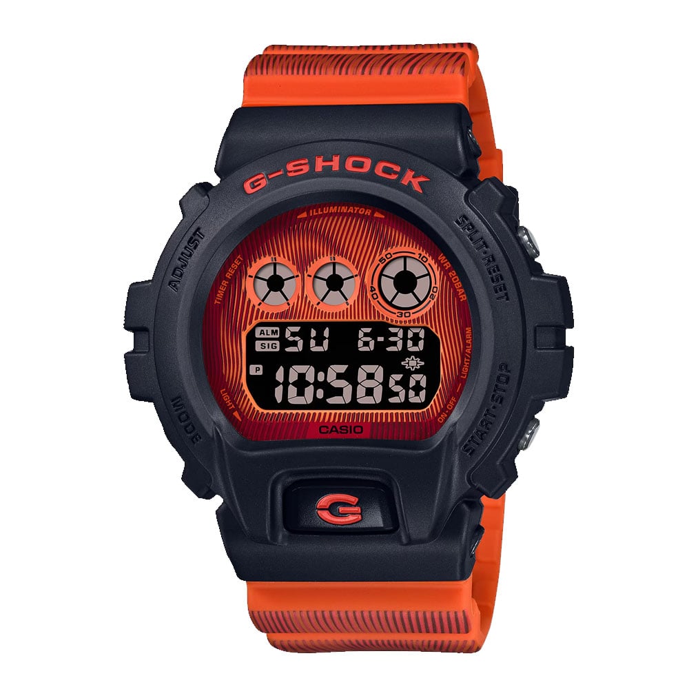 Jump into a time warp! Time Distortion watches make an impact as powerful as the G-SHOCK itself. nnThe band and dial are printed in patterns that playfully distort time and space in vibrant fluorescent colors that transport you into the world of science fiction. nnYour choice of the iconic digital DW-D5600, the DW-5900 with its triple graph design, or the DW-6900 with its distinctive front button design.