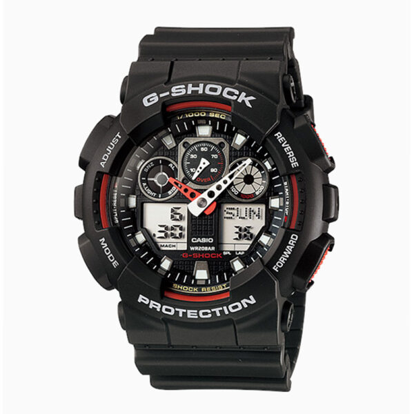 Introducing a collection of new G-SHOCK models whose 35mm diameter faces and large cases give them a look of power and strength. nDial rings and raised hour markers create three-dimensional depth that gives the face plenty of character. nThe popular G-SHOCK three-dial face design incorporates one analog dial in the center, with digital dials on either side. nThese watches are designed and engineered to deliver outstanding shock resistance and water resistance, as well as anti-magnetism. nOver-sized buttons come with a checkered anti-slip surface to make operations fast and sure. n1/1000-second stopwatch, velocity indicator, World Time, 5 alarms and much more provides these models with unmatched function and performance.