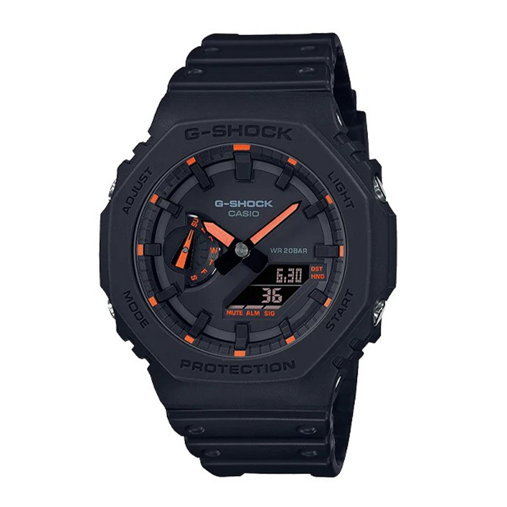 Make a splash with color set against matte black in a special design that pops with neon accents. nnThe octagonal shape and streamlined design of the GA-2100 puts on textured matte black and vibrant neon color for a stylishly cool new look. Hour and minute hands with phosphorescent paint stay visible in the dark to keep you on your game all day and night.