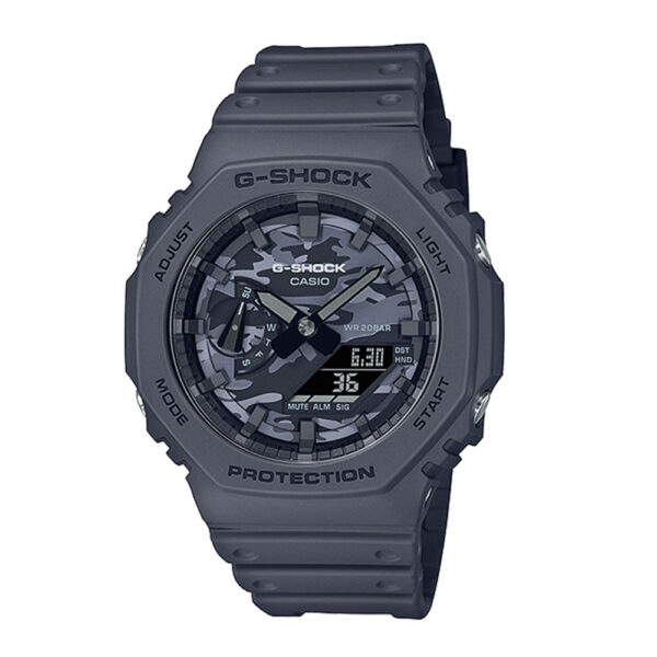 A watch that goes with you all the way from the wild outdoors to the inner city, in just-right colours that fit in anywhere. Featuring an original G-SHOCK camouflage motif on the dial.