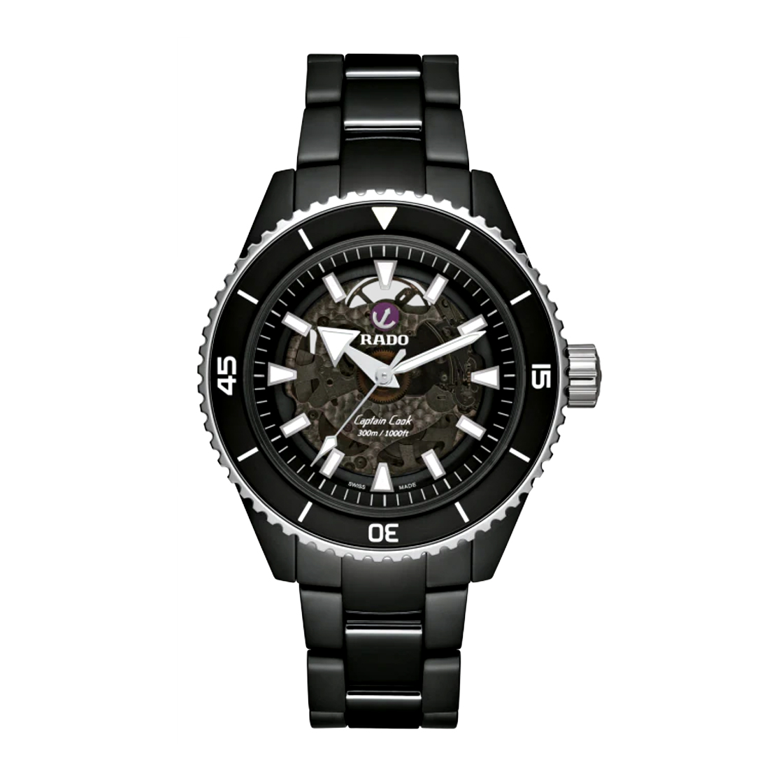 Rado Captain Cook Automatic R32127152 A bold 43mm divers watch crafted from high-tech ceramic, stainless steel, and titanium with PVD coating. Powered by an automatic movement, it offers 300m water resistance and robust durability at just 157g. Swiss-made for precision and adventure.