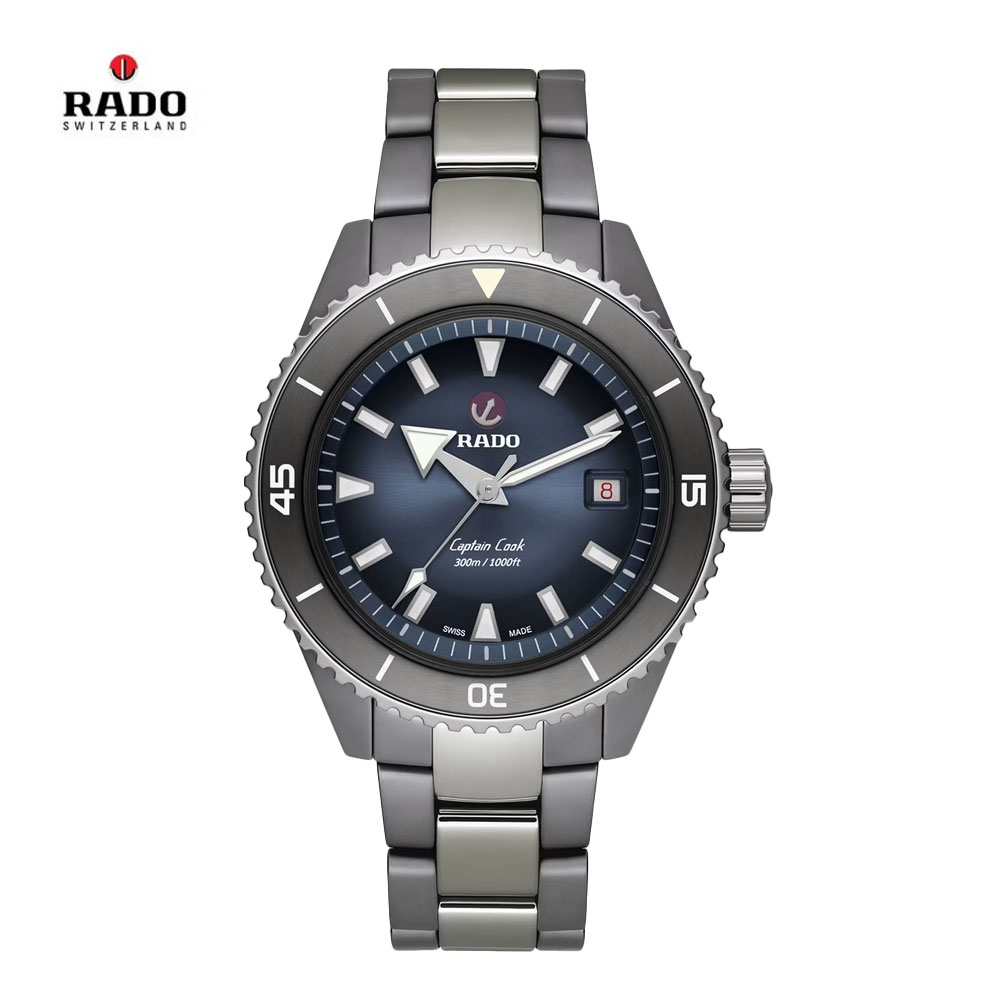 The Captain Cook High-Tech Ceramic Diver watch is water resistant down to 300 m. The hands and indices of the ISO 6425 certified diver’s watch are coated with SuperLuminova® to ensure excellent visibility on the blue lacquered and polished dial. The 43 mm monobloc case is made of matte plasma high-tech ceramic, while the rotating bezel is made of polished stainless steel. Inside, the Rado R763 automatic movement exceeds standard accuracy test requirements from 3 to 5 positions and offers 80 hours of power reserve. This model comes with a polished, plasma, high-tech ceramic bracelet. Whatever your field of exploration is, your Captain Cook High-Tech Ceramic Diver will be a reliable and solid partner at your side for years to come.