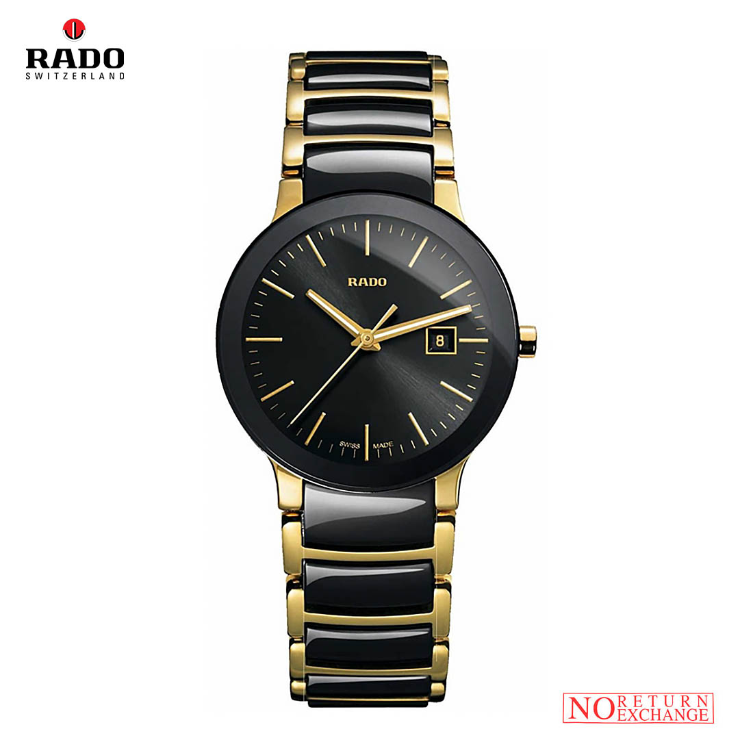 Rado Centrix R30930152 A refined ladies dress watch featuring a 28 mm yellow gold PVD stainless steel case with black ceramic accents. The black dial showcases luminous gold-tone hands, index markers, and a date display at 3 oclock. Protected by sapphire crystal, this Swiss-made quartz timepiece offers elegant style with 30 m water resistance and a sleek gold-and-black ceramic bracelet.