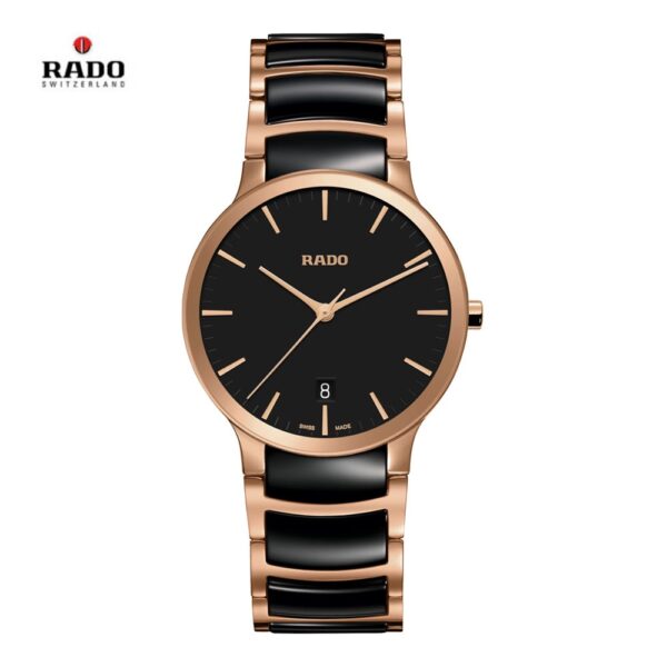 Rado 073.0554.3017 (R30554172) Centrix Men Watch. The case is made out of rose gold stainless steel with a rose gold bezel, which stands for the high quality of the item, it has a black dial. This model has got 100 meters of water resistance. it can be worn in scenarios where it is likely to be splashed but not immersed in water and will be fine in rain. The watch is shipped with an original box and a guarantee from the manufacturer.