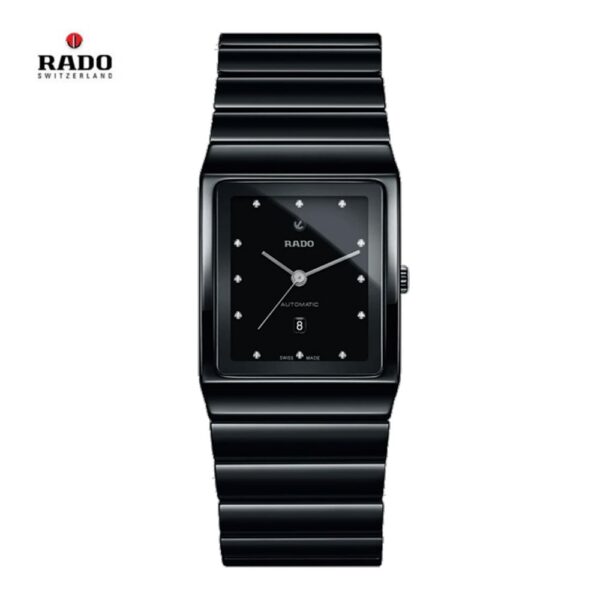 Rado Ceramica Automatic R21807702 A Swiss Made mens watch with a 30 x 41.7 mm black high-tech ceramic rectangular case and bracelet, black dial set with 12 diamond markers, and date display at 6 oclock. Powered by automatic movement with sapphire crystal and 50m water resistance, it combines modern ceramic design with refined luxury.