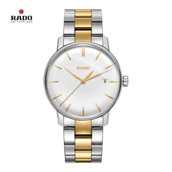 Rado True R22864032 A Swiss Made mens dress watch featuring a 37.7mm stainless steel case with yellow gold Ceramos® center links, white dial with gold-tone hands, and date display at 3 oclock. Powered by Rado calibre 115 quartz movement with sapphire crystal and 50m water resistance, it offers timeless elegance with modern durability.