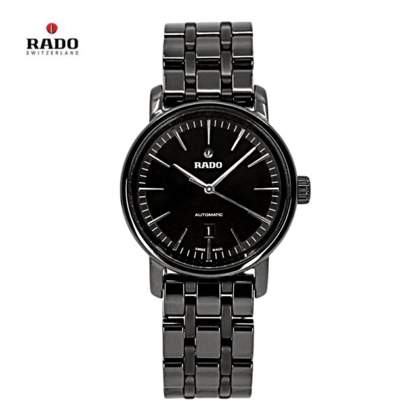 Rado Diamaster Automatic R14043182 A Swiss Made ladies watch featuring a 33mm black hi-tech ceramic case and bracelet, black dial with silver-tone hands, and date display at 6 oclock. Powered by the ETA 2681 automatic movement with 38-hour power reserve, it includes sapphire crystal, transparent case back, and 50m water resistance for refined everyday elegance.