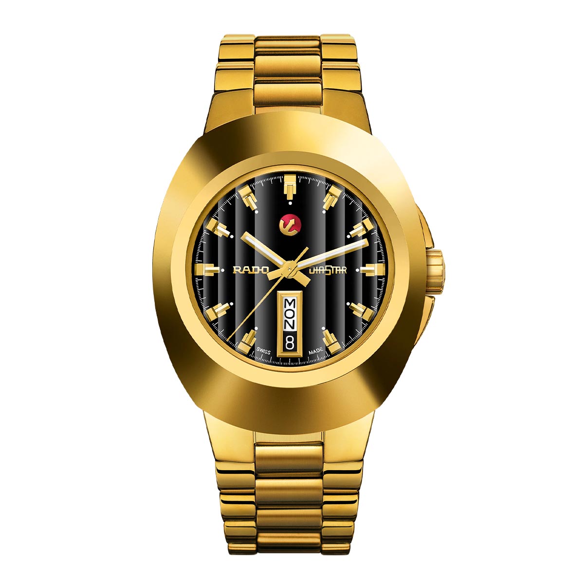 Rado The Original Automatic R12999153 A mens Swiss Made watch with a 38.5mm gold-tone stainless steel case and bracelet, paired with a sleek black dial. Powered by automatic movement, it offers 100m water resistance and 2-year warranty, blending durability with timeless style.