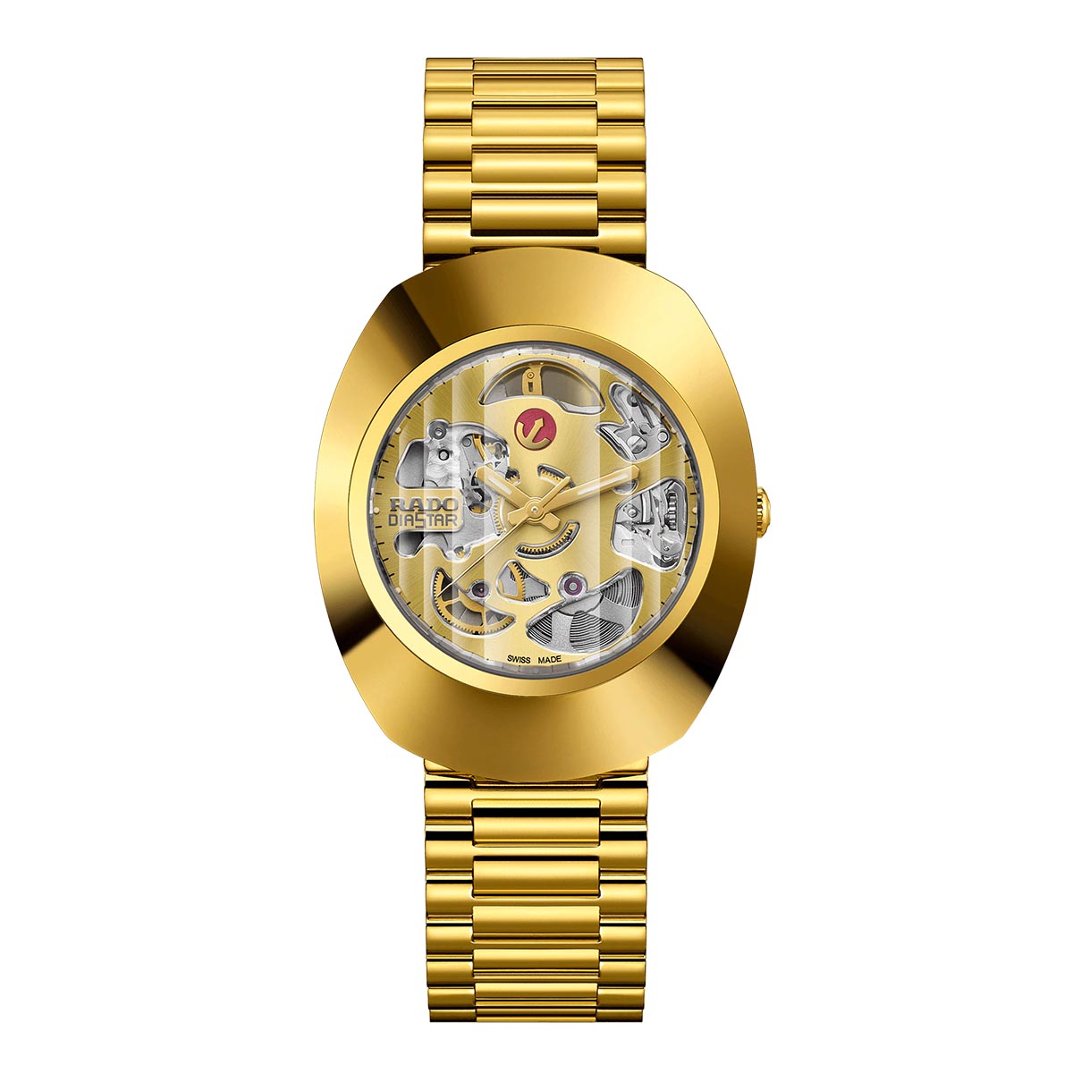 Rado The Original Automatic R12064253 A Swiss Made timepiece featuring a 35mm oval yellow gold-tone stainless steel case and bracelet, gold dial with luminous hands, automatic movement, sapphire crystal, and transparent case back. Water resistant to 30m, this elegant casual watch blends timeless style with precision craftsmanship.