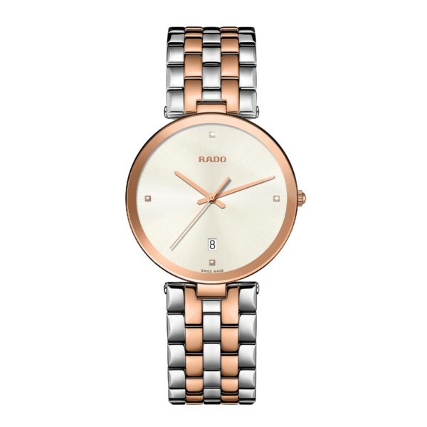 Rado 115.3889.2073 (R48869733) Florence Mens Watch. The case is made out of rose gold stainless steel with a rose gold bezel, which stands for the high quality of the item, it has a white dial. This model has got 30 meters of water resistance. it can be worn in scenarios where it is likely to be splashed but not immersed in water and will be fine in rain. The watch is shipped with an original box and a guarantee from the manufacturer.