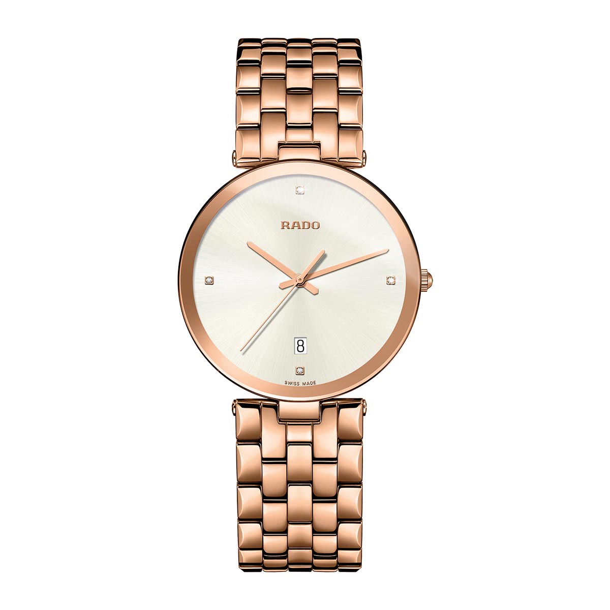 Rado Florence Classic R48869734 A timeless analog quartz watch featuring a white dial adorned with diamonds and a date display. Encased in durable stainless steel with a round 3640 mm case, it pairs elegantly with a rose gold stainless steel bracelet. Perfect blend of luxury and sophistication.