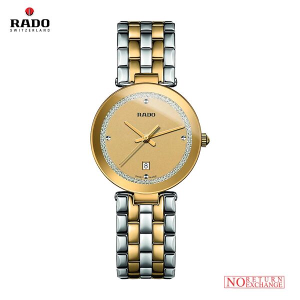 Rado Florence Classic R48872263 A refined quartz analog watch with a champagne dial and date display, set in a 2630 mm round stainless steel case. Complemented by a sleek silver stainless steel bracelet, it offers timeless elegance in a compact design.