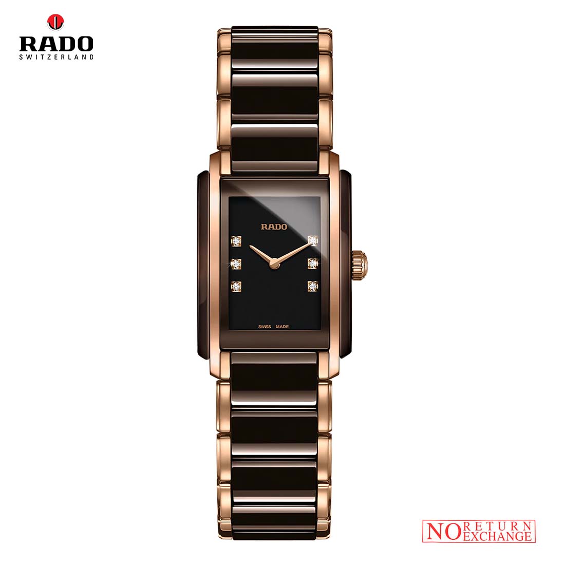 Rado Integral Diamonds R20199722 A Swiss Made ladies quartz watch featuring a 22.7 x 33.1 mm brown ceramic and rose gold-plated steel case, black dial set with 6 diamonds (0.039 ct), and a matching ceramic/rose gold bracelet. Powered by the ETA 976.001 movement, it offers sapphire crystal and 50m water resistance for refined luxury and everyday elegance.