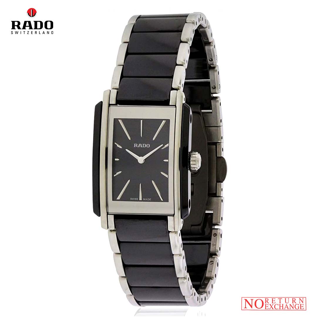 Rado Integral R20223152 A Swiss Made ladies luxury watch featuring a 22.7mm rectangular stainless steel and black ceramic case, black dial with silver-tone hands, and a stainless steel bracelet with ceramic center links. Powered by quartz movement with sapphire crystal and 50m water resistance, it embodies sleek elegance and modern design.