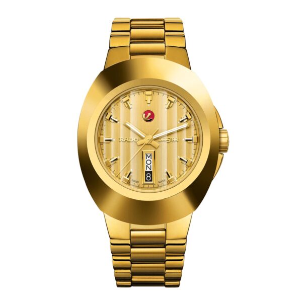 Rado New Original Automatic R12999253 A Swiss Made mens dress watch featuring a 38.5mm oval gold-tone stainless steel case and bracelet, gold dial with luminous hands, and day-date display at 6 oclock. Powered by automatic movement with sapphire crystal and 100m water resistance, it blends bold style with lasting precision.
