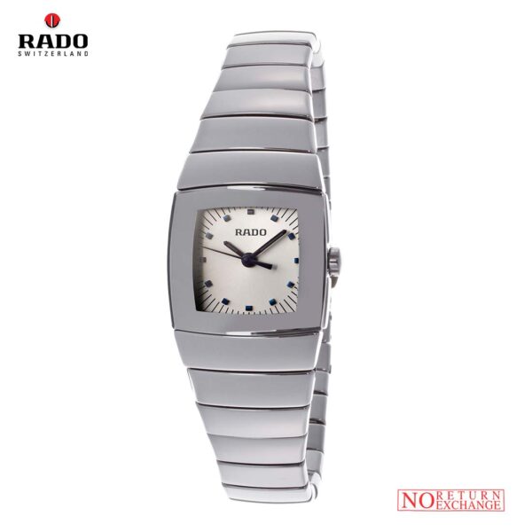 Rado Sintra Mini R13722102 A Swiss Made ladies dress watch with a 30x22mm platinum-tone ceramic case and bracelet, silver dial with blue hands, and quartz movement. Finished with sapphire crystal, deployment clasp, and 30m water resistance, it offers sleek elegance in a timeless ceramic design.