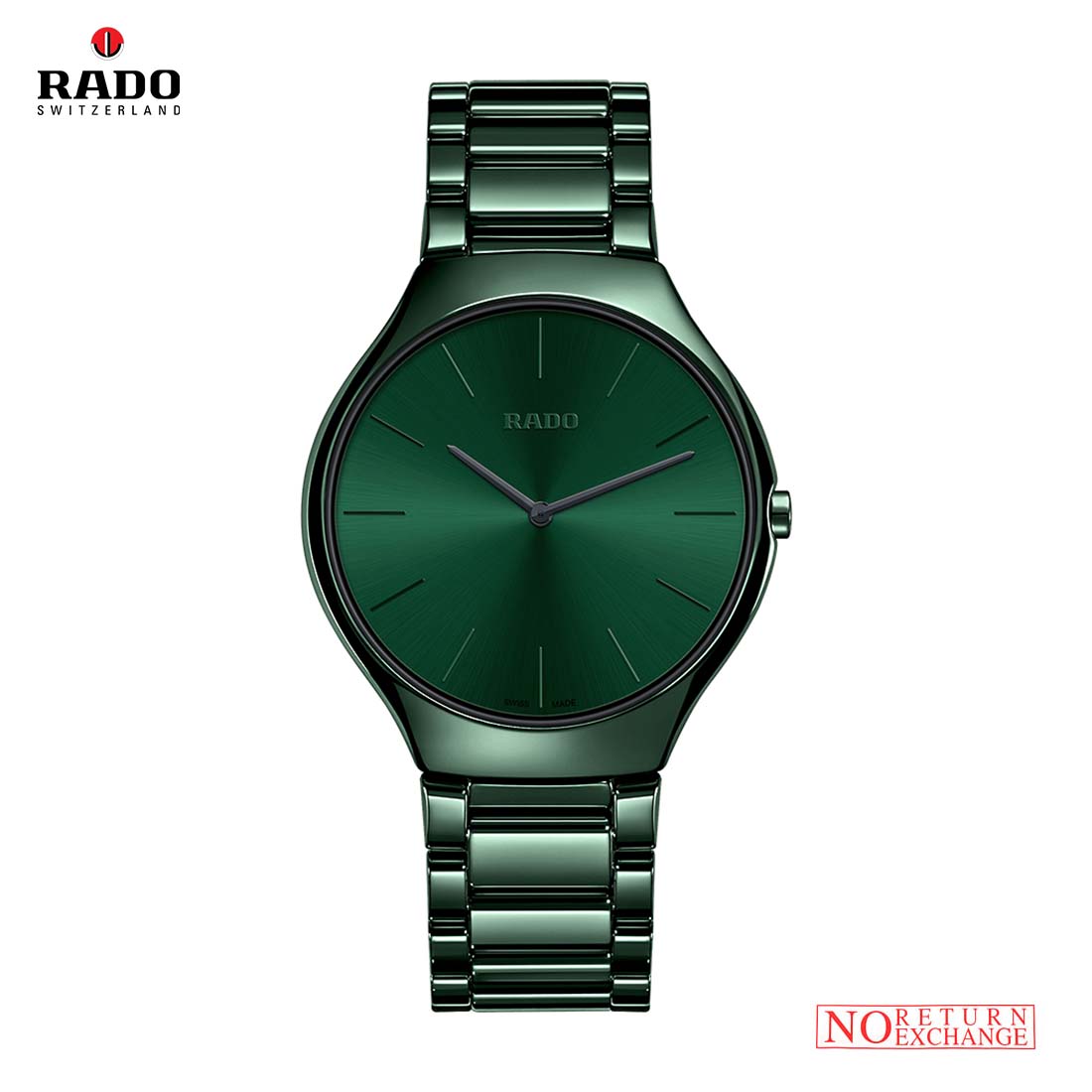 Rado True Thinline Colors R27264312 A sleek and modern mens watch crafted from high-tech green ceramic with a slim 5 mm profile. Featuring a matching green dial with black hands, scratch-resistant sapphire crystal, and a ceramic bracelet with butterfly clasp. Powered by Swiss quartz (Rado Calibre 140), this minimalist timepiece offers hours and minutes with 30 m water resistance a stylish everyday casual watch.