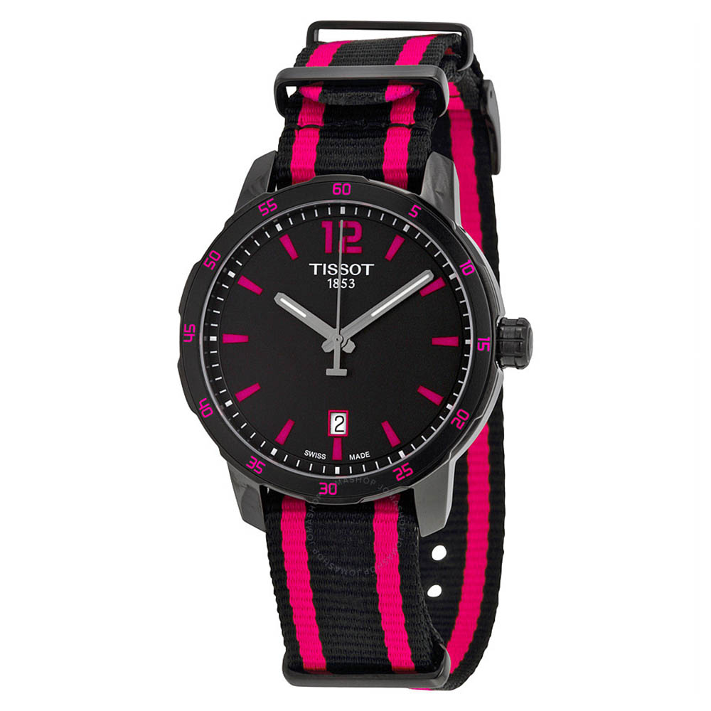 Black PVD stainless steel case with a black and pink NATO nylon strap. Fixed black PVD top ring bezel. Black dial with luminous silver-tone hands and index hour markers. An Arabic numeral appears at the 12 o’clock position. Minute markers around the outer rim. Dial Type: Analog. Luminescent hands and markers. Date display above the 6 o’clock position. ETA caliber F06.111 quartz movement. Scratch resistant sapphire crystal. Pull / push crown. Solid case back. Round case shape. Case size: 40 mm. Case thickness: 9.12 mm. Band width: 19 mm. Tang clasp. Water resistant at 100 meters / 330 feet. Functions: date, hour, minute, second. Casual watch style. Watch label: Swiss Made. Tissot Quickster Black Dial Black and Hot Pink Nylon Ladies Watch T0954103705701.