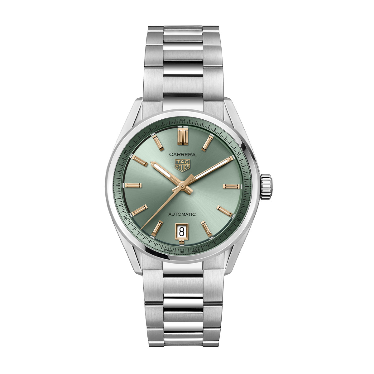 The subdued pastel green shades of the sunray brushed dial add a singular touch of luxurious elegance to this TAG Heuer Carrera. With its ergonomic steel bracelet and its powerful Calibre 7 movement, this classic timepiece is the ideal urban ally