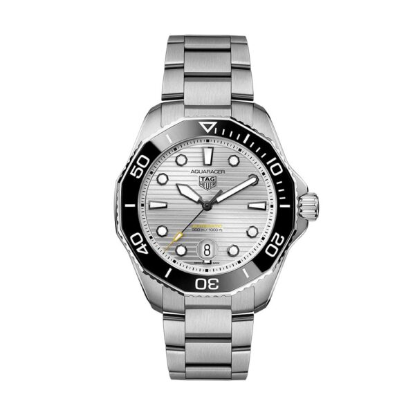 This new special edition TAG Heuer Aquaracer with a vibrant silver sunray brushed dial is a true diving watch. Bold black gold-plated hands and hour markers generously filled with white Super-LumiNova? for unrivalled legibility.